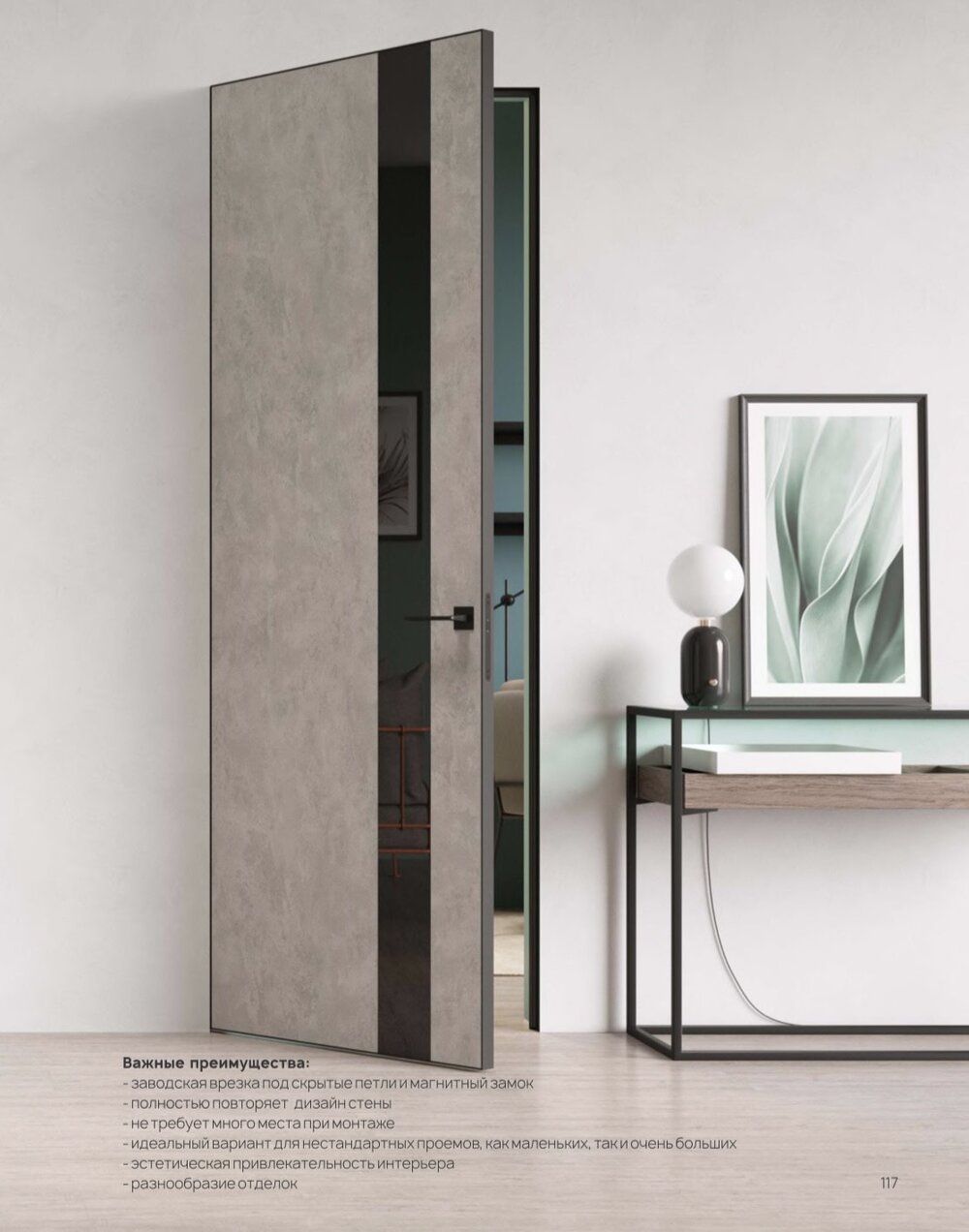 • Скрытый короб для межкомнатных дверей значительно экономит пространство и визуально расширяет пространство.