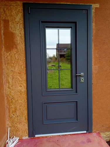 МДФ 10 мм, стеклопакет 2х камерный, внешнее стекло тонировано серебром, металлическая решетка окрашена в цвет наружной отделки